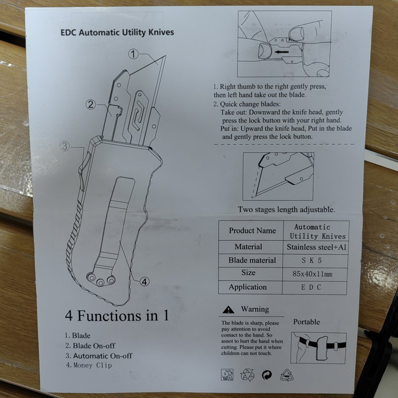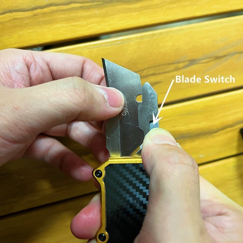 Description: This small Out The Front utility knife fits in a pocket, removes the replacement blade, and comes in a beautiful gift box. It has an excellent safety device to keep the blade from dropping in any situation, and the handle is made of carbon fiber material, making it smoother in the hand.